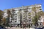 Фасад дома № 19 членён на плоскости трёхгранными эркерами, переходящими на уровне шестого-седьмого этажей в обрамлённые колоннами лоджии. Верхний этаж также выделен сплошным рядом балконов. Торцы обоих зданий акцентированы рядами Г-образных балконов, выполняющих роль раскреповки фасадных плоскостей[1]. |