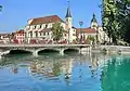 - Островной дворец, расположенный в центре канала Тью, построен в 1132 году. На протяжении истории здание выполняло разные административные функции, в частности, резиденции правителя Анси, городского суда и городской тюрьмы. В 1900 году Островной дворец был признан историческим памятником Анси, сегодня в нём расположен Музей города.