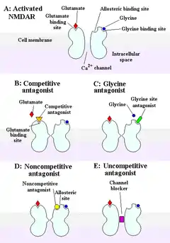 Токсичность при перевозбуждении нейронов, или эксайтотоксичность, во многом связана с активностью NMDA-рецепторов, и поэтому исследователи возлагали надежды на применение антагонистов в противодействии эксайтотоксичности при травмах мозга, инсульте, нейродегенеративных заболеваниях, таких как болезнь Альцгеймера, болезнь Паркинсона, болезнь Гентингтона. Противовесом служит риск развития лезий Олни,[29] хотя есть свидетельства того, что они не возникают у людей, к тому же успешно начат поиск средств для предотвращения данного осложнения.[28][26] Неблагоприятные побочные эффекты стали причиной провала большинства клинических испытаний NMDA-антагонистов, поскольку рецепторы играют важную роль в работе глутаматергической системы.[30] Вмешательством в нормальную работу мозга можно объяснить и гибель нейронов, иногда отмечающуюся при использовании антагонистов.[31]
