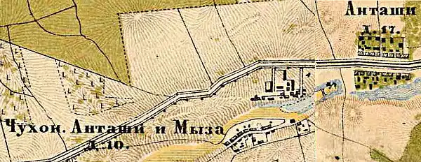 АНТАШИ РУССКИЕ — деревня генерала Медема, по почтовому тракту, число дворов — 14, число душ — 48 м. п.(1856 год)[17]