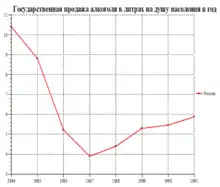К концу 1970-х годов потребление спиртных напитков в СССР достигло рекордного уровня в истории страны. Потребление алкоголя, которое не превышало 5 литров на человека в год ни в Российской империи, ни в эпоху Сталина[5], достигло к 1984 году отметки в 10,5 л зарегистрированного алкоголя, а с учётом подпольного самогоноварения могло превышать 14 л. По оценкам, такой уровень потребления был эквивалентен примерно 90—110 бутылкам водки в год на каждого взрослого мужчину, исключая небольшое количество трезвенников[6] (собственно водка составляла около ⅓ этого объёма. Остальной алкоголь употреблялся в форме самогона, вин и пива[7]). Однако если в СССР на душу населения приходилось 11 литров крепких напитков, 19 литров вина и 23 литра пива, то во Франции 6 литров крепких напитков, 90 литров вина и 44 литра пива.[8]