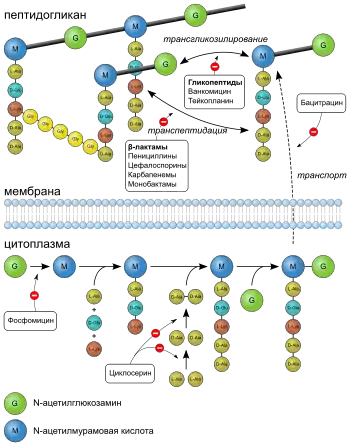 - Нарушение синтеза клеточной стенки посредством ингибирования синтеза пептидогликана (пенициллин, цефалоспорин, монобактамы), образования димеров и их переноса к растущим цепям пептидогликана (ванкомицин, флавомицин) или синтеза хитина (никкомицин, туникамицин). Антибиотики, действующие по подобному механизму, обладают бактерицидным действием, не убивают покоящиеся клетки и клетки, лишённые клеточной стенки (L-формы бактерий).