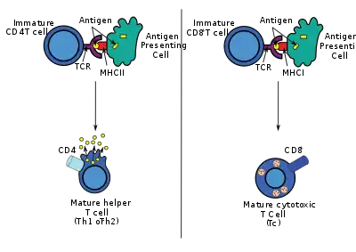 T-клетки должны быть активированы, чтобы делиться и выполнять свои функции. Активация T-клетки происходит в результате её взаимодействия посредством T-клеточного рецептора с комплексом MHC II класса и антигена, экспонированным на поверхности профессиональной антигенпрезентирующей клетки. Чаще всего в активации T-клеток принимают участие дендритные клетки. На свободные антигены T-клетки не реагируют. T-хелперы могут распознавать экзогенные антигены, презентированные в комплексе с MHC II класса. T-киллеры могут также распознавать эндогенные пептиды, выставленные непрофессиональными АПК в комплексе с MHC I класса[4][11]. АПК могут также представлять эндогенные и экзогенные антигены липидной природы T-клеткам и натуральным киллерам с помощью белков семейства CD1, которые структурно близки к MHC I класса[12].