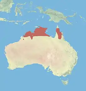 Эндемик Австралии, где он распространён в северных муссонных тропических эвкалиптовых редколесьях с подлеском из многолетних трав. Вид также встречается во вторичных лесах, на лугах и пастбищах. Обычно обитает ниже 500 м над уровнем моря.