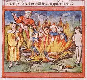 Нападки на евреев неизбежно усиливались в годы различных бедствий, а также при массовых народных возмущениях, особенно в городах, где часть из них занималась ростовщичеством или составляла конкуренцию торгово-ремесленным слоям коренного населения. Так, в годы эпидемии «чёрной смерти» (1348—1349) расправы над евреями, в том числе сожжения их на костре, имели место в Париже, Базеле, Эрфурте, Страсбурге, Аугсбурге, Зальцбурге, Фрайбурге, Мюнхене, Констанце[67]. Изолированность проживания евреев в средневековых европейских городах и наличие у них элементарных правил личной гигиены приводили к тому, что смертность среди них была ниже, что лишь усугубляло подозрения толпы, подстрекаемой фанатиками. При этом, католическая церковь в лице папы Климента VI решительно осудила подобные вспышки насилия, приводя в качестве аргумента существование поражённых чумой городов, в которых никаких евреев не было[68].