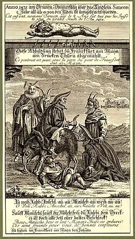 В христианских странах власти и идеологи обосновывали действия, направленные против евреев, отрицанием последними божественной природы Христа и якобы содержащейся в Талмуде хулой на него. Так, по утверждению Мартина Лютера, иудеи публично называли Иисуса колдуном, а его матерь — блудницей.[27]. Часто евреев обвиняли в наживе за счёт ростовщичества, заниматься которым христианам в средневековой Европе было запрещено.