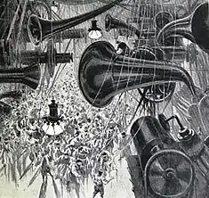 «Великое зловоние» в Лондоне впервые придало новое значение понятию «загрязнение окружающей среды» и составило контраст с традиционным утопическим образом большого города, как средоточия красоты и культуры. По времени это совпало с появлением антиутопического жанра, и проблема утилизации промышленных отходов стала одним из основных мифологических концептов экологических движений. В литературе одним из первых эти мотивы стал использовать Жюль Верн в романе «Пятьсот миллионов бегумы» 1879 года. В этом же романе впервые оказались совмещены образы цветущей утопии и закопчённой выбросами антиутопии, предназначенные для разных социальных классов[50]. Крайнего выражения эта амбивалентность достигла в «Машине времени» Герберта Уэллса, с описанием элоев и морлоков. В романе Жюля Верна впервые был поднят и важнейший аспект социальной экологии: жизнь промышленных рабочих полностью подчинена ритму их труда и рабочих смен, вплоть до того, что человек становится придатком машины. Собственно, впервые образ порабощения человека машиной, вторжения механизации во внутреннюю жизнь и духовность появился у романтиков, в частности, у Томаса Карлейля. Соответственно, и Машина превращается у романтиков в сатанинского двойника Природы. Визуальный ряд антиутопии такого рода представил Фриц Ланг в фильме «Метрополис»[51].