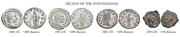 Поначалу проект увенчался успехом и антониниан, вес которого колебался около 5 граммов, к середине III века смог вытеснить из обращения денарий. После середины III века антониниан был в массовом использовании, но быстро потерял свою покупательную способность. Количество серебра в монете упало с 50% до менее 30% в середине столетия. Вскоре расстройство финансов империи привело к дальнейшей порче антониниана, который при Галлиене начал выпускаться из серебра значительно худшей пробы, а затем и вовсе стал бронзовой или медной монетой (иногда сверху покрытой серебром) с принудительным курсом обращения. Последующие императоры пытались восстановить курс монеты, но безуспешно.