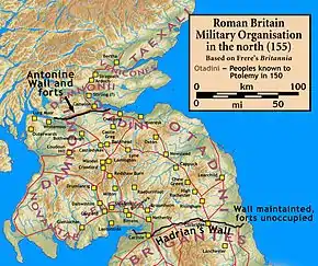 Военная деятельность римлян, показанная в Британии, была противопоставлена бездействию в остальных провинциях империи. Тут политика разительно отличалась от политики предшественника Антонина Адриана, по приказу которого был возведён носивший его имя вал[24]. В 139 году император назначил на пост легата провинции Британия Квинта Лоллия Урбика[24]. До этого Урбик участвовал в подавлении восстания Бар-Кохбы под начальством Юлия Севера, затем, после исполнения обязанностей консула в 135 году, был наместником Нижней Германии[24]. В 140 году в провинции вспыхнуло восстание племени бригантов, которое было подавлено[60]. После Урбик начал активные наступательные действия в Северной Британии. Точные причины кампании неизвестны, но это могло быть желание Антонина иметь славу завоевателя[24]. Легат одержал ряд побед и продвинул имперскую границу вглубь острова[24]. В 142 году началось строительство оборонительного вала в самом узком месте между заливами Ферт-оф-Форт и Ферт-оф-Клайд, представлявшего собой 58-километровую стену из торфа, стоявшую на фундаменте из булыжников шириной 4,3 метра и возвышавшуюся над глубоким рвом[60]. Основные работы велись силами солдат трёх римских легионов: XX Победоносного Валериева, VI Победоносного и II Августова[61]. К югу от стены проходила военная дорога, вдоль которой находились через каждые две мили небольшие форты с гарнизонами, окружённые насыпями и канавами[60].