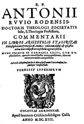 - Antonius Ruvio Rodensis. Commentarii in libros Aristotelis Stagiritae de Caelo, et Mundo: unam cum dubijs, et quaestionibus in Schola agitari solitis. Matriti: ex Typographia Andrea Grande, 1615, 32.