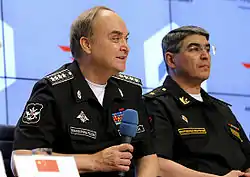 | Выступление перед иностранными военными атташе в НЦУО РФ, 21 марта 2015 года. | С министром обороны РФ Сергеем Шойгу на совещании глав военных ведомств государств – членов ШОС, 30 июня 2015 года. | На торжественном приёме по случаю 88-й годовщины образования НОАК, 24 июля 2015 года. | На пресс-конференции по случаю начала военных учений, 30 июля 2015 года. |