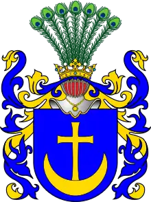 Щит увенчан дворянскими шлемом и короной. Нашлемник: три страусовых пера. Намёт на щите голубой, подложенный золотом.