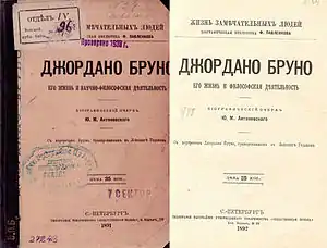 - Антоновский Ю. М.. Джордано Бруно: Его жизнь и философская деятельность. Биографический очерк. С портретом Джордано Бруно, гравированным в Лейпциге Геданом. (Жизнь замечательных людей. Биографическая библиотека Ф. Ф. Павленкова) — Санкт-Петербург: Типография товарищества «Общественная польза». 1891 (1892)[20]