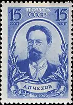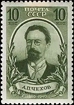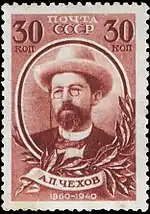 Серия первых почтовых марок, посвящённых А. П. Чехову, была выпущена в СССР в феврале 1940 года к 80-летию со дня рождения писателя. На четырёх миниатюрах были изображены его портреты: на марках номиналом в 10 копеек (ЦФА [АО «Марка»] № 720) и 15 копеек (ЦФА [АО «Марка»] № 721) — по фотографии 1898 года, номиналом в 20 копеек (ЦФА [АО «Марка»] № 722) и 30 копеек (ЦФА [АО «Марка»] № 723) — по картине А. Иваницкого.