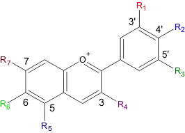 | Мальвидин | -OCH3 | -OH | -OCH3 | -OH | -OH | -H | -OH |