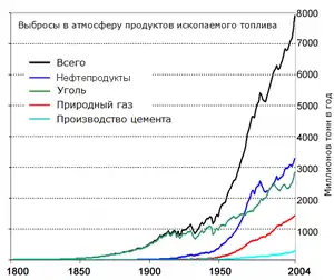 Основной геологически значимый признак человеческой активности — это увеличение уровня углекислого газа (CO2) в атмосфере Земли. За последний миллион лет концентрация CO2 в атмосфере колебалась от 0,018 до 0,028 %. В результате деятельности человека его уровень, начиная с начала промышленной революции, стал расти. К 2019 году уровень CO2 достиг 0,041 %[19], в основном в результате сжигания ископаемого топлива, включая уголь, нефть и природный газ, а также производства цемента и уменьшения площадей, покрытых лесом.