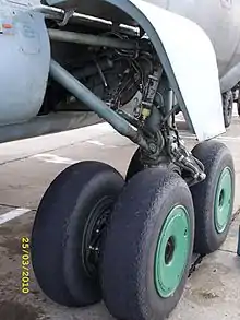 Шасси включает три опоры: переднюю, две основные. База шасси — 9,58 м, колея — 4,92 м. Основные опоры шасси убираются к оси симметрии самолёта, а передняя — назад по полёту. Основная и передняя опоры состоят из: телескопической амортизационной стойки, четырёхколёсной тележки (основная) и двух сблокированных колёс (передняя), складывающегося подкоса, цилиндра уборки-выпуска, замков и механизма управления створками. Также в состав основной опоры входит стабилизирующий амортизатор и подкосная ферма. Передняя опора — управляемая, потому в её состав ещё входит рулевой цилиндр-демпфер и механизм поворота со следящей системой. Все опоры оснащены азотно-масляными амортизаторами. Колёса основных опор КТ-77 размером 1050×300 мм снабжены дисковыми тормозами и инерционными антиюзовыми датчиками УА-23/2. Передние колёса К2-92/1 без тормозов, размером 900×300 мм, они могут поворачиваться на угол ±35° от рулевого штурвальчика либо на угол ±6° от педалей управления. Пневматики колёс полубаллонного типа. Давление в пневматиках основных колёс — 6,5 кгс/см², передних — 5,0 кгс/см².