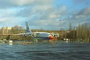 В лётных испытаниях самолёта доказана возможность работы самолёта со слабоподготовленными грунтовыми площадками длиной 600 метров, даже если на борту самолёта при этом будет находиться до 20 тонн груза. Получение заданных характеристик обеспечивается, в первую очередь, уникальной силовой установкой — двигатель Д-27 (Запорожье) и винтовентилятор СВ-27 (производства АО «НПП Аэросила», Ступино, Россия); попытки создания подобного рода силовых установок предпринимались различными двигателестроительными фирмами мира, но реально осуществлен только этот проект. Взлётная мощность силовой установки 14 000 л. с. За счёт очень высокой степени сжатия воздуха в компрессоре (к = 30) достигается высокая экономичность (при максимальных взлётных весах часовой расход топлива на четыре силовые установки — 3,5—4 тонны).