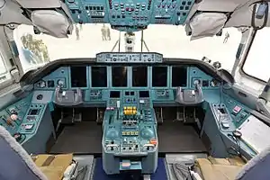 - электронная дистанционная система управления самолёта, благодаря заложенным в неё алгоритмам управления обеспечивает удобное и безопасное управление самолётом. К примеру, отказ любого двигателя в полёте практически не требует вмешательства летчика для сохранения прямолинейности полета. Обеспечивается автоматическая защита от выхода самолёта на закритические режимы полета, такие как сваливание, чрезмерное скольжение или крутая спираль.