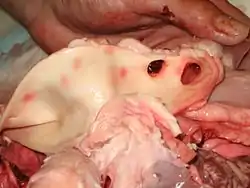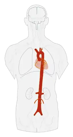 Ао́рта (лат. aorta, др.-греч. ἀορτή) — самый большой непарный артериальный сосуд большого круга кровообращения[1]. Аорту подразделяют на три отдела: восходящую часть аорты, дугу аорты и нисходящую часть аорты, которая, в свою очередь, делится на грудную и брюшную части[2].