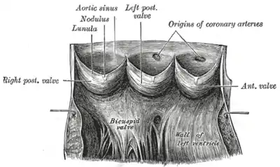 Используется также термин «аортально-клапанный комплекс».[2] В узком смысле под аортальным клапаном понимают запирательный элемент, состоящий из трёх створок, трёх комиссур и фиброзного кольца.