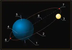 Околоземная орбита космического тела. Апогей обозначен точкой 7