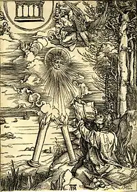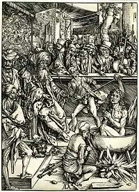 Первая гравюра посвящена иллюстрации не Откровения, а жизни святого. Согласно легенде, Иоанн был приговорён к смерти за отказ поклоняться языческим богам — его варили в кипящем масле. Однако он остался невредим и был сослан на остров Патмос, где и написал Откровение.