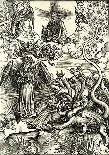 На гравюре Дюрер продолжает иллюстрировать Главу 12 Откровения:
