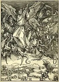 В верхней части гравюры доминирующую роль играет архангел Михаил, поражающий дракона копьём. Три других ангела сражаются с монстрами.