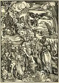На гравюре Дюрер иллюстрирует Главу 8 Откровения: