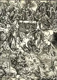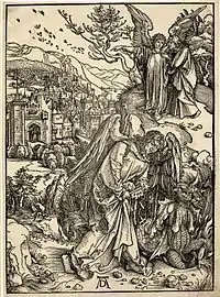 На гравюре Дюрер иллюстрирует два фрагмента Откровения. Первый фрагмент из Главы 20: