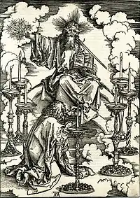 На гравюре Дюрер иллюстрирует Главу 1 Откровения:
