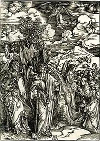 Вверху Бог с серпом. Рядом с ним три ангела: один также с серпом, другой с Т-образным крестом. Дюрер иллюстрирует Главу 14 Откровения: