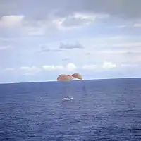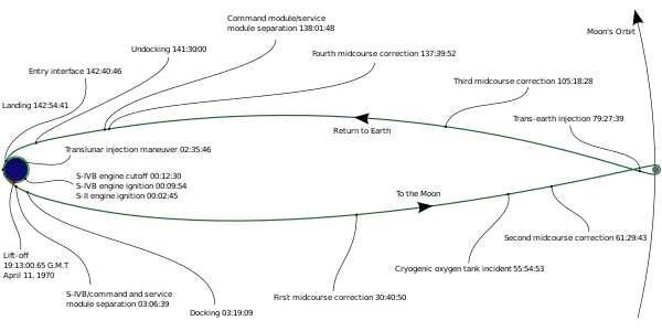 - Использование маршевого двигателя служебного модуля — «прямое прерывание». Один из разработанных ещё до полёта аварийных сценариев. Корабль разворачивался служебным модулем в направлении движения, и его двигатель, обладавший тягой в 22 500 фунт-сил (10 200 кгс) включался на пять минут, что обеспечивало сначала полное погашение скорости корабля, а затем разгон его в направлении обратно к Земле.[38] Преимущество этого варианта состояли в значительном сокращении времени перелёта (почти на 2 дня); приводнение ожидалось на 118 часу в Тихом океане, где у Хьюстона имелись спасательные команды. Однако не было известно, уцелел ли этот двигатель при аварии; кроме того, существовали опасения, что теплозащита спускаемого аппарата может не выдержать повышенной посадочной скорости. Этот вариант был отброшен сразу и единогласно.