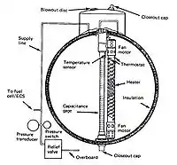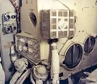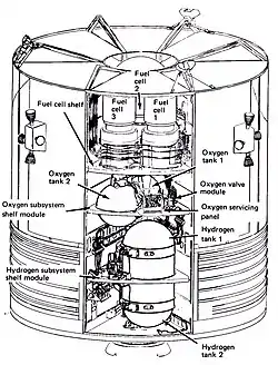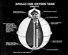 - Кислород. Лунный модуль нёс значительный запас кислорода, поскольку план миссии предусматривал два выхода на поверхность Луны, и, соответственно, два цикла сброса атмосферы кабины с её последующим восстановлением.[35] Даже с учётом того, что три астронавта совместно потребляли 0,23 фунта (100 г) кислорода в час, имеющегося в баках количества хватало более чем на неделю.[35]