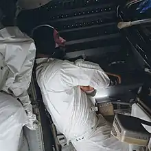 - Жизнеобеспечение. Ресурс сменных патронов (двух рабочих и трёх запасных) с поглотителем углекислого газа (гидроксидом лития) лунного модуля был рассчитан на дыхание двух человек в течение 53 часов.[36] Находившиеся в нём теперь три астронавта выработали бы этот ресурс менее, чем за 36 часов.[36] Эта ситуация была сразу спрогнозирована инженерами центра управления полётом, поэтому к тому времени как гранулы гидроксида лития достигли насыщения, экипажу был предложен способ использования патронов из командного модуля.