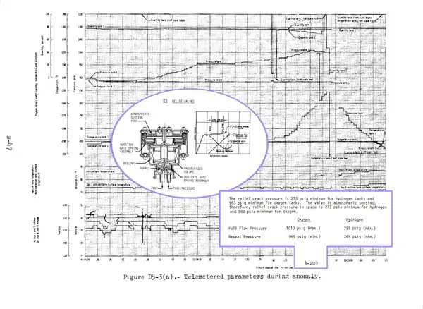 Когда давление упало ниже определённого уровня, система автоматически переключилась на использование кислорода из уравнительного бака командного модуля.[29] Исчерпание этого запаса кислорода было недопустимо, поскольку он обеспечивал дыхание экипажа в ходе возвращения на Землю, и центр управления полётом потребовал отключить уравнительный бак от кислородной системы.[30] Последней отчаянной попыткой остановить утечку стал приказ на закрытие отсечных клапанов трубопроводов, ведущих к двум отказавшим топливным элементам, в предположении, что причиной утечки является повреждение последних. Способа открыть однажды закрытые клапаны не существовало, поэтому такое распоряжение означало официальную отмену высадки на Луне. Сначала был закрыт клапан топливного элемента № 3, а когда это не помогло — топливного элемента № 1, но утечка так и не прекратилась.[31]