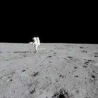 Примерно через десять минут Митчелл снял с корпуса посадочной ступени тележку и собрал первые образцы грунта, а Шепард установил телекамеру на штатив в 15 метрах от лунного модуля.