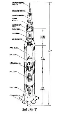 Ракета-носитель «Сатурн-5» состояла из трёх ступеней[14][15]. На первой ступени, S-IC, были установлены пять кислородно-керосиновых двигателей F-1, общей тягой 33 400 кН. Первая ступень работала 2,5 минуты и разгоняла космический аппарат до скорости 2,68 км/с (в инерциальной системе отсчёта)[16]. Вторая ступень, S-II, использовала пять кислородно-водородных двигателей J-2, общая тяга которых составляла 5115 кН. Вторая ступень работала приблизительно 6 минут, разгоняя космический аппарат до скорости 6,84 км/с и выводя его на высоту 185 км[17]. На третьей ступени, S-IVB, был установлен один двигатель J-2 тягой 1000 кН. Третья ступень включалась дважды: после отделения второй ступени она работала 2,5 минуты и выводила корабль на орбиту Земли, а вскоре после выхода на орбиту включалась ещё раз и за 6 минут выводила корабль на траекторию полёта к Луне[18]. Третья ступень выводилась на траекторию столкновения с Луной (начиная с полёта «Аполлона-13»; в предыдущих полётах к Луне ступень выходила на околосолнечную орбиту) для исследования геологии Луны: при падении ступени на Луну за счёт её кинетической энергии происходил взрыв, сейсмические волны от которого регистрировались аппаратурой, оставленной предыдущими экипажами.