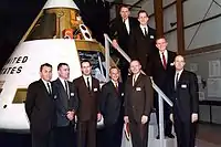 21 марта 1966 года был объявлен состав экипажа первого пилотируемого корабля по программе Аполлон: Вирджил Гриссом, Эдвард Уайт, Роджер Чаффи (дублёры: Джеймс Макдивитт, Дэвид Скотт и Рассел Швейкарт). Предполагалось, что он совершит полёт в последнем квартале того же года. В сентябре был объявлен экипаж и второго пилотируемого корабля: Уолтер Ширра, Донн Айзли и Уолтер Каннингем (дублёры: Фрэнк Борман, Томас Стаффорд и Майкл Коллинз). Однако из-за неготовности командно-служебного модуля в декабре было решено перенести первый полёт на конец февраля 1967 года, а второй полёт в том виде, в котором он был запланирован, был признан излишним и отменён. Тройка Ширры стала дублирующим экипажем Гриссома. Всего до конца 1967 года НАСА надеялось осуществить три пилотируемых полёта. Во втором теперь планировалось впервые испытать лунный модуль. Основным здесь стал экипаж Макдивитта, дублёры были обновлены — Томас Стаффорд (командир), Джон Янг и Юджин Сернан. Третий полёт должен был стать пилотируемым дебютом ракеты-носителя «Сатурн-5». Командно-служебный модуль предполагалось вывести на высокую околоземную орбиту с апогеем 6400 км. К этой миссии стали готовиться Фрэнк Борман, Майкл Коллинз и Уильям Андерс (основной экипаж) и Чарльз Конрад, Ричард Гордон и Клифтон Уильямс (дублирующий экипаж)[34]. Однако трагедия «Аполлона-1», случившаяся 27 января 1967 года и приведшая к гибели Гриссома, Уайта и Чаффи в результате пожара на стартовой площадке № 34, задержала американскую лунную программу[35], первый пилотируемый полёт («Аполлон-7») состоялся через 21 месяц[36].