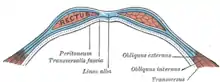 Апоневрозы мышц передней брюшной стенки образуют влагалище прямой мышцы живота. Влагалище имеет переднюю и заднюю пластинки, при этом задняя стенка влагалища на уровне нижней трети прямой мышцы отсутствует, и прямые мышцы живота задней поверхностью соприкасаются с поперечной фасцией.