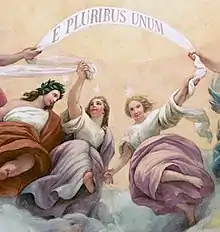 Формируют круг вокруг Свободы и Виктории 13 дев, каждая — со звездою над своей головой, представляющие Тринадцать колоний. Несколько дев повёрнуты спиной к Вашингтону, что якобы представляет колонии, которые отделились от Союза ко времени написания картины. Зеркально над Вашингтоном изображён девиз E Pluribus Unum, означающий «Из многих — единое».