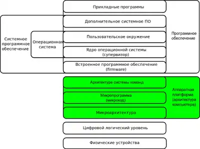 Аппаратная платформа компьютера (архитектура компьютера) — уровень, образованный программной архитектурой компьютера (микроархитектура, микропрограмма, управления ядром микропроцессора и архитектурой набора команд) на аппаратной базе (конкретных микросхем процессора, чипсета, других физических компонентов, которые в совокупности составляют аппаратную модель вычислительной системы).