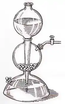 Раствор в нижнем резервуаре прибора служит затвором, препятствующим выделению газа обратно через воронку во время опыта. Нижний резервуар обычно имеет тубулус, закрытый притёртой стеклянной пробкой: он необходим для слива жидкости после использования прибора.