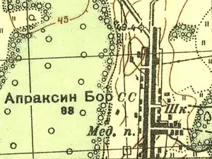 АПРАКСИН БОР — деревня, православных — 507, мужчин — 263, женщин — 244, обоего пола — 507. (1897 год)[8]