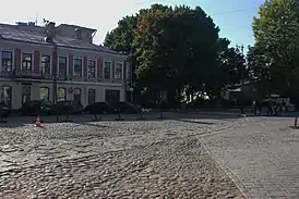 ![]() Бывшая аптека и контуры барбакана на площади | |