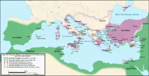 Религиозный мир в Византии наступил с утверждением Македонской династии в 867 году[71], в то время как империя Аббасидов распалась на множество частей после 861 года. Василий I Македонянин возродил Византийскую империю, её военную мощь и продуманную церковную политику, позволившую наладить отношения с Римом. Василий вступил в союз с императором Священной Римской империи Людовиком II против арабов, и его флот очистил Адриатическое море от их кораблей[72].