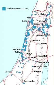 Арабские силы пытались отрезать Иерусалим от прибрежной части страны, где находилось большинство еврейских поселений, а еврейские формирования пытались сохранить связь с Иерусалимом и обезопасить связывающую Тель-Авив и Иерусалим дорогу. На первом этапе войны еврейским силам не удалось выполнить эту задачу, хотя связь между Иерусалимом и еврейскими поселениями на побережьях поддерживалась при помощи вооружённых конвоев, которым удавалось пробиться в Иерусалим. Предпринимались также попытки захвата еврейских населённых пунктов в других районах страны[34]; вероятно, первой такой попыткой стало нападение 8 декабря арабского отряда на район Ха-Тиква в Тель-Авиве, отражённое «Хаганой» с тяжёлыми потерями со стороны атакующих[35]. Согласно Моррису, основными районами военных действий в период с ноября 1947 до середины мая 1948 года стала территория, отведенная ООН под создание еврейского государства (за исключением транспортного коридора из Тель-Авива в Иерусалим), в том числе, почти не было столкновений в заселённых арабами Верхней Галилее и Самарии[36].