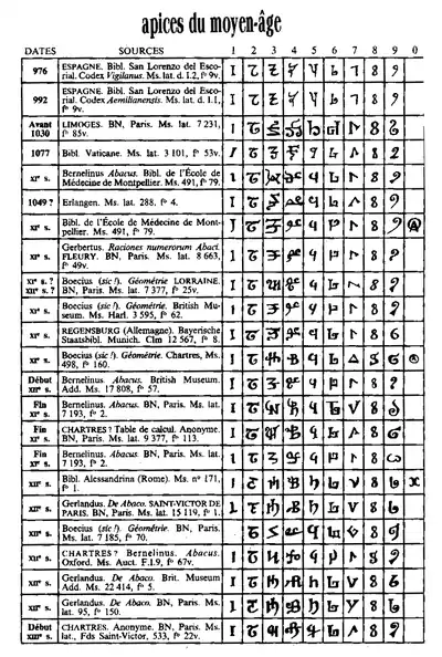 Арабские цифры стали известны европейцам в X веке[6]. Первое их описание содержит «Вигиланский кодекс» (Испания, X век), причём ноль ещё не упоминается[8]. В других странах Западной Европы история индоарабских цифр начинается с XII века, а их широкое применение в Западной Европе — с XIII—XIV веков[9].