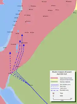 Первые столкновения мусульман с Византией, владевшей Сирией и Палестиной, произошли в 629—630 гг., но не привели к серьёзной войне. Полномасштабные военные действия начались в правление халифа Абу Бакра в 634 году, после подавления Ридды в Аравии. В арабской армии были организованы четыре корпуса, которые должны были действовать на разных направлениях в Палестине и Сирии. Их возглавили Абу Убайда ибн аль-Джаррах, Язид ибн Абу Суфьян, Амр ибн аль-Ас и Шурахбил ибн Хасан. Главным среди них Абу Бакр назначил Абу Убайду. В конце апреля 634 года, арабские войска, выступившие из Медины, достигли Табука и начали вторжение на территорию византийской Палестины. Приграничные отряды византийцев были легко рассеяны корпусами Язида и Амра.